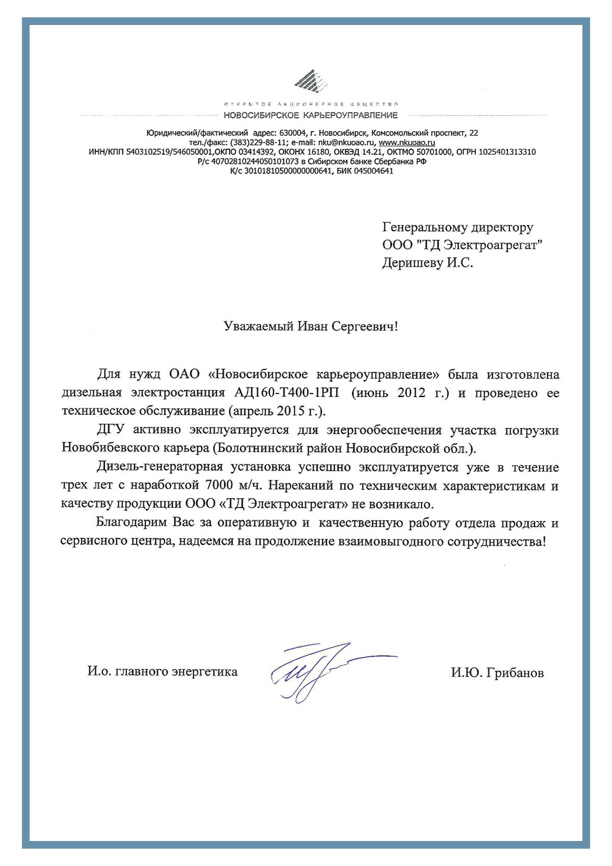 ) ) [reviewBody] => Уважаемый Иван Сергеевич!    Для нужд ОАО "Новосибирское карьероуправление" была изготовлена дизельная электростанция АД160-Т400-1РП (июнь 2012 г) и проведено ее техническое обслуживание (апрель 2015 г.)    ДГУ активно эксплуатируется для энергообеспечения участка погрузки Новобибевского карьера (Болотнинский район Новосибирской обл.).     Дизель-генераторная установка успешно эксплуатируется уже в течение трех лет с наработкой 7000 м/ч. Нареканий по техническим характеристикам и качеству продукции завода "ТД Электроагрегат" не возникало. Благодарим Вас за оперативную и качественную работу отдела продаж и сервисного центра, надеемся на продолжение взаимовыгодного сотрудничества. И.о. главного энергетика  И.Ю. Грибанов ) ) )